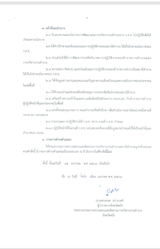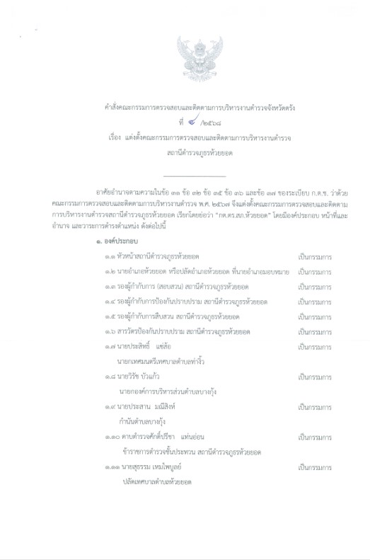 คำสั่ง แต่งตั้งคณะกรรมการตรวจสอบและติดตามการบริหารงานตำรวจ สถานีตำรวจภูธรห้วยยอด